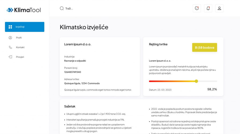 Provjerite kako KlimaTool može pomoći vašoj tvrtki. Ako je vaš primarni cilj rast ili stabilnost vašeg poslovanja, tada bi razumijevanje klimatskih prijetnji i osiguranje vašeg poslovanja trebali biti prioritet. Za učinkovit rad potreban vam je alat za procjenu kreditnog rizika u različitim klimatskim scenarijima.